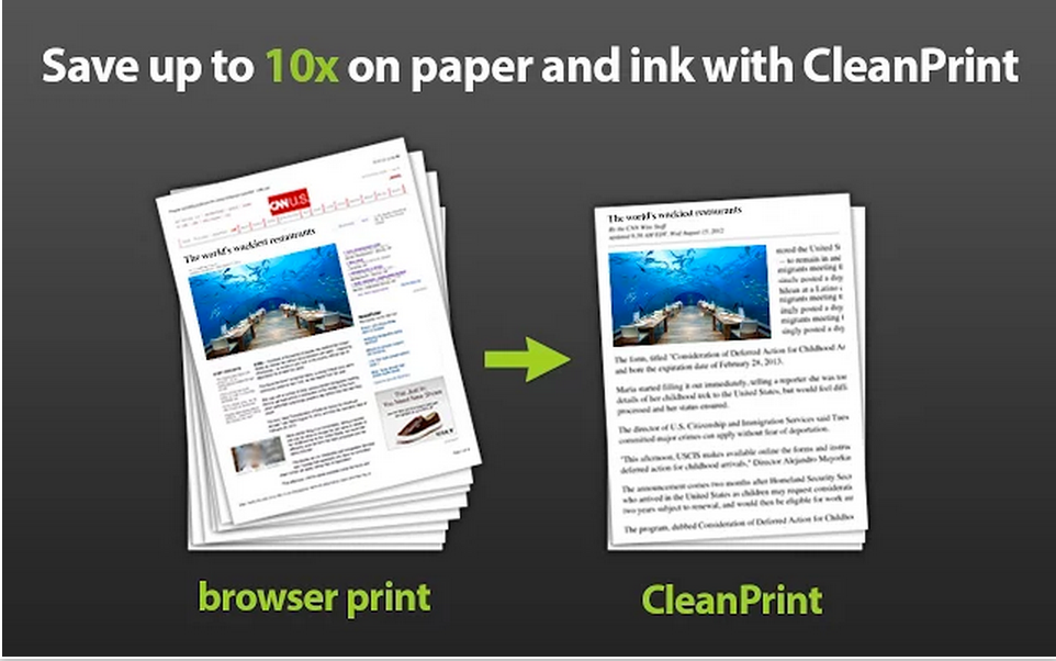 CleanPrint puts you in control of saving paper, ink and money when printing from the web. You can edit content before saving articles to Print, PDF, Google Docs, Google Drive, Dropbox or Box.net.