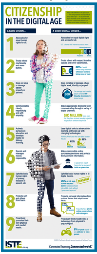 Here is a new visual from ISTE on the concept of digital citizenship. The visual outlines some of the features characterizing ‘good’ digital citizens based on attributes of good citizens. The elements of digital citizenship, according to ISTE, “ are not so different from the basic tenets of traditional citizenship: Be kind, respectful and responsible, and just do the right thing”. The ideas are pretty basic and will definitely give students a very good initiation into this huge concept of digital citizenship. I would suggest that you print it off and use it in class.