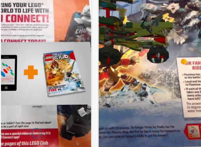 ‘Explore exciting 4D content using LEGO Connect and the LEGO Club magazine. LEGO® Connect offers a rich portal that lets you activate every type of interaction with seamless utility. To access additional content in LEGO® publication look for pages and pictures with the LEGO Connect icon. Connect to learn more about LEGO sets, product designer videos and instantly view 3D models.’
