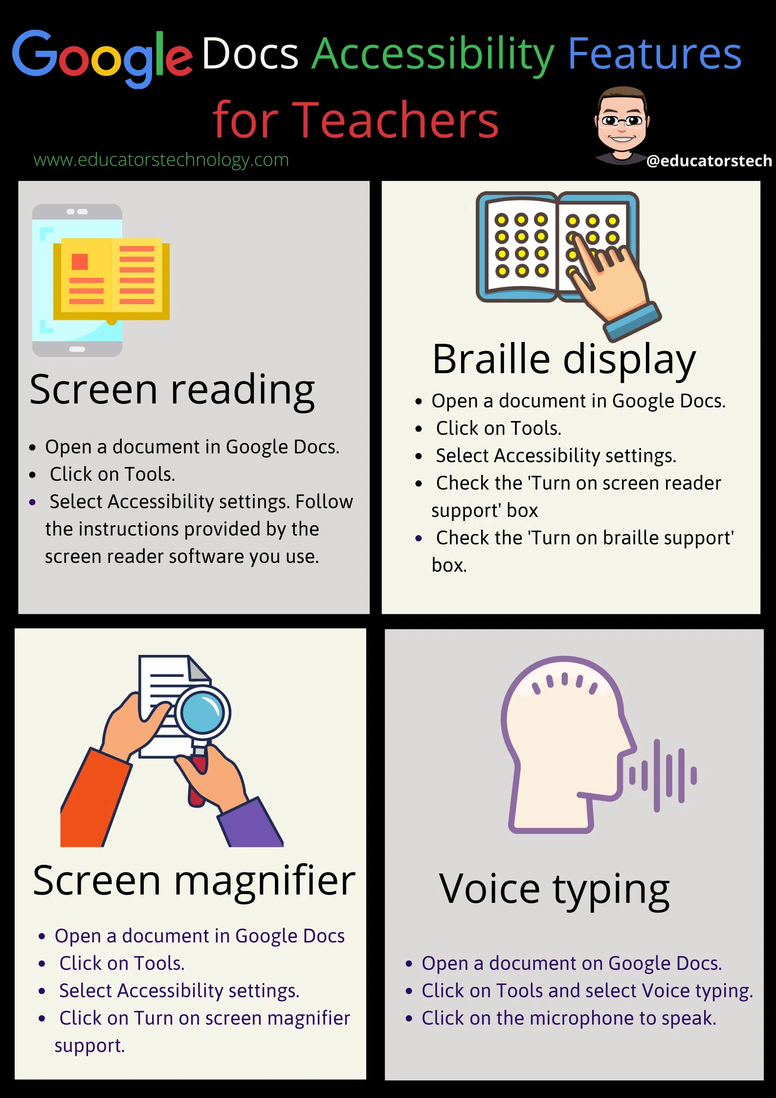 Google Docs editor embeds a number of important accessibility features that you can use with your students in class. Drawing on information from Docs Help I summarized the four main accessibility features namely voice typing, screen magnification, Braille display, and screen readers. I also outlined steps on how to access each of these functionalities from within your documents. Some of these features work on Google Slides and Sheets.