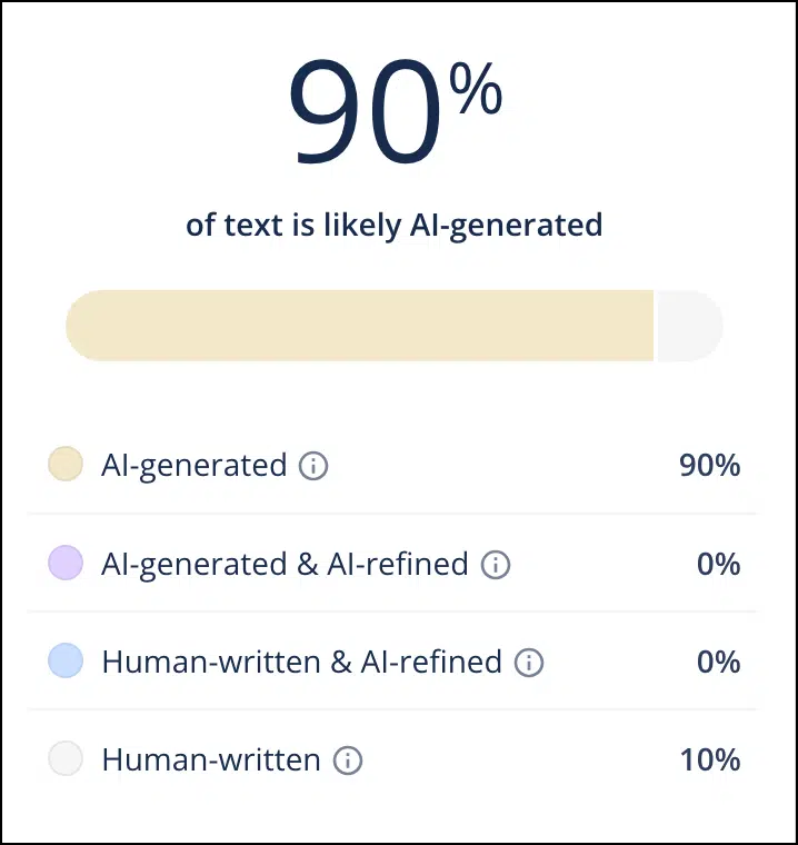 But when it comes to the AI generated sample, Scribbr was able to flag it as AI generated but with a score of 90%. It is still a high score but definitely nothing compared to Originality and GPTZero. Scribbr also identified 10% of my ChatGPT generated text as being human-written, a false negative.