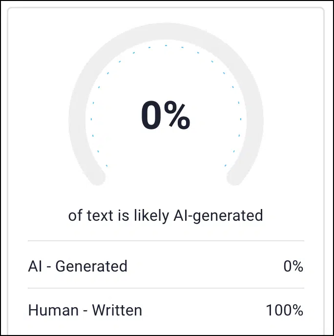 I tried a number of other AI checkers but did not include them here. For instance, Merlin AI Checker did not pass my test. I scanned my AI generated sample and it returned a meagre score of 14% likelihood of it being AI generated.