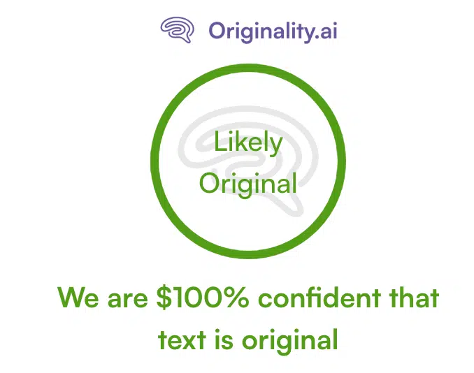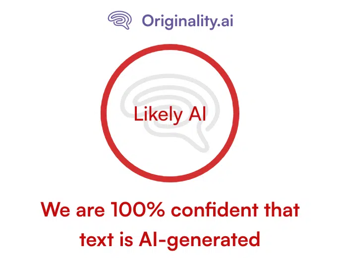 Originality is another powerful AI checker for teachers. It passed my test with flying colours. I started with the AI generated sample and it confidently detected it as 100% AI content:
