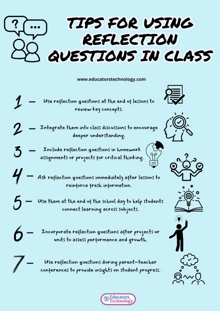 - During Parent-Teacher Conferences: Reflection questions can also be useful during parent-teacher conferences. Teachers can share these reflections with parents to provide them with insights into their child’s learning process, strengths, and areas of improvement.