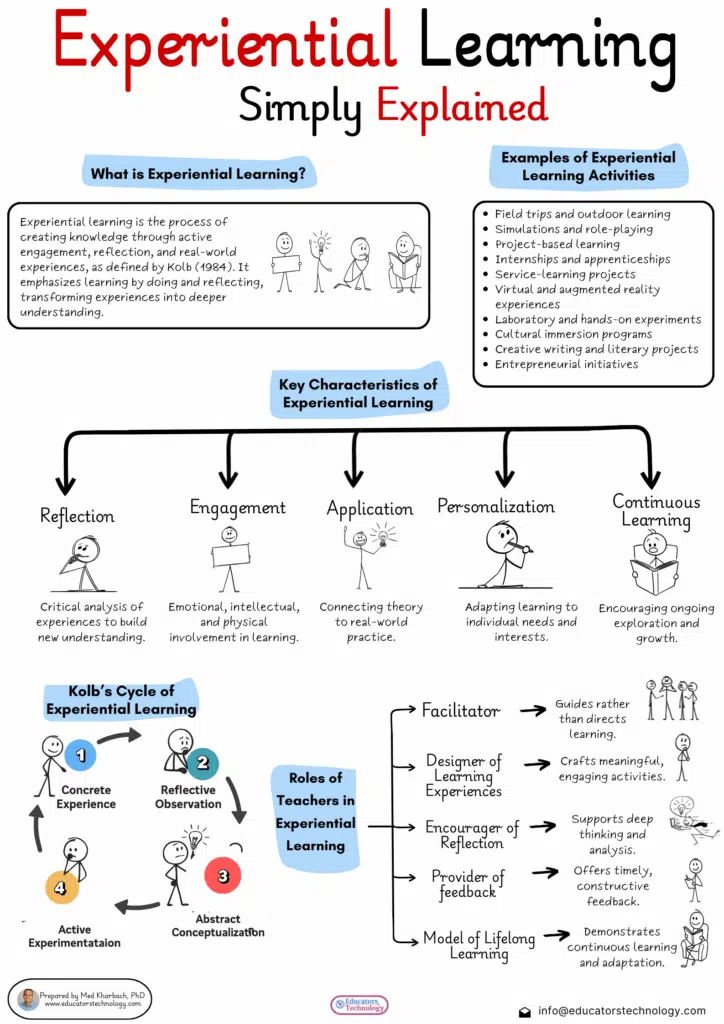 In this post, I am taking you on a journey through the core ideas behind experiential learning. We will start with a clear definition, grounded in Kolb’s (1984) influential theory, then move through its essential characteristics like reflection, engagement, and application. I will also walk you through the important role we as teachers play shifting from being the center of attention to becoming facilitators, guides, and co-learners.