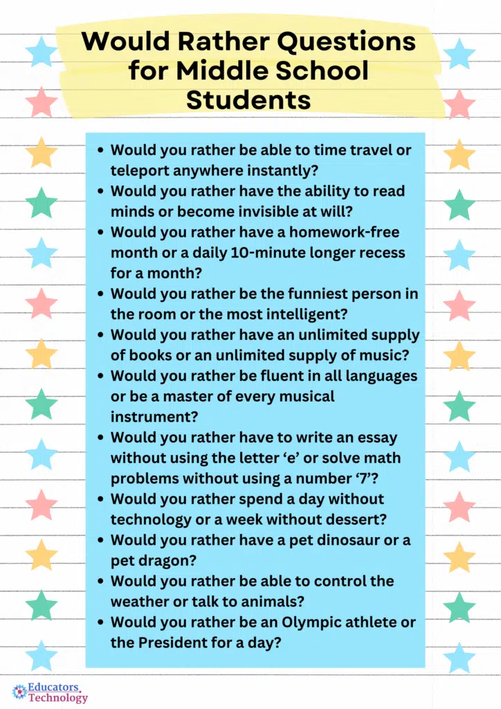 Here are some interesting examples of would rather questions for middle school students to consider: