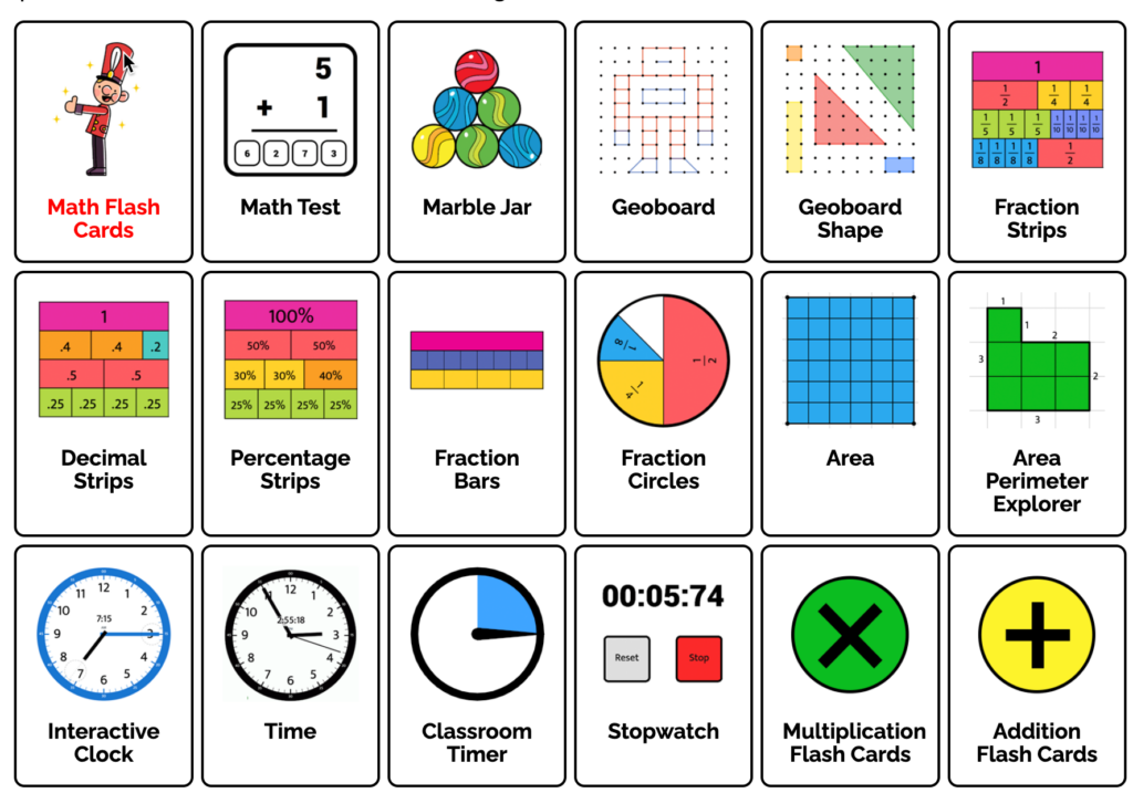 Examples of teachers tools provided by Toy Theatre include: Math Flash Cards, Geoboard, Marble Jar, Fraction Strips, Area Perimeter Explorer, Classroom Timer, Interactive Clock, Times Table, Spinner, Protractor, Coin Flip, Number Line, Magnets, and many more.