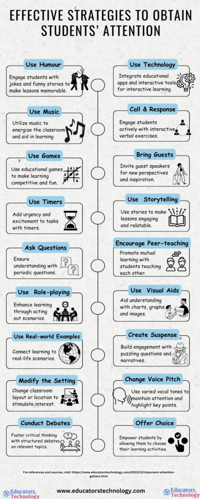 Here are some practical attention grabbers/ attention getters to use in your class to keep students engaged and focused: