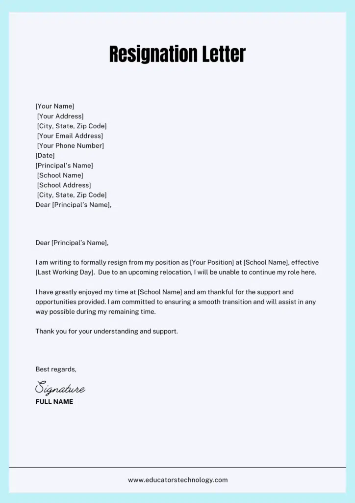 I am writing to formally resign from my position as [Your Position] at [School Name], effective [Last Working Day]. Due to an upcoming relocation, I will be unable to continue my role here.