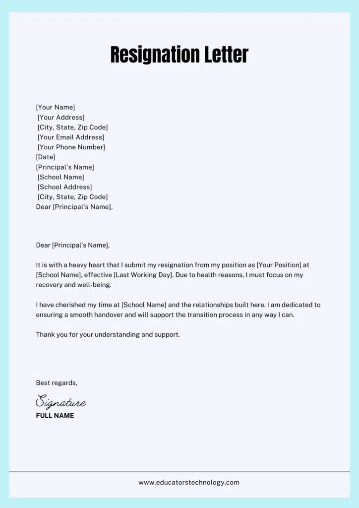 It is with a heavy heart that I submit my resignation from my position as [Your Position] at [School Name], effective [Last Working Day]. Due to health reasons, I must focus on my recovery and well-being.