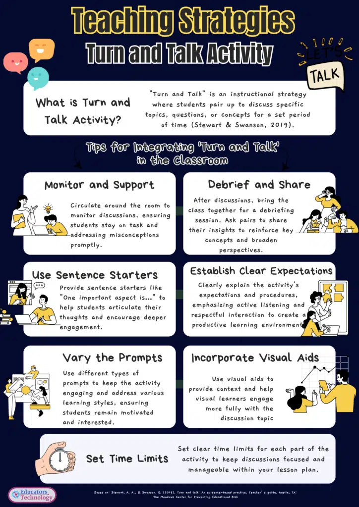 Here are some practical tips to help you effectively integrate “Turn and Talk” into your classroom activities. These insights, informed by Stewart and Swansson (2019), can enhance student engagement and learning outcomes through structured peer interactions.