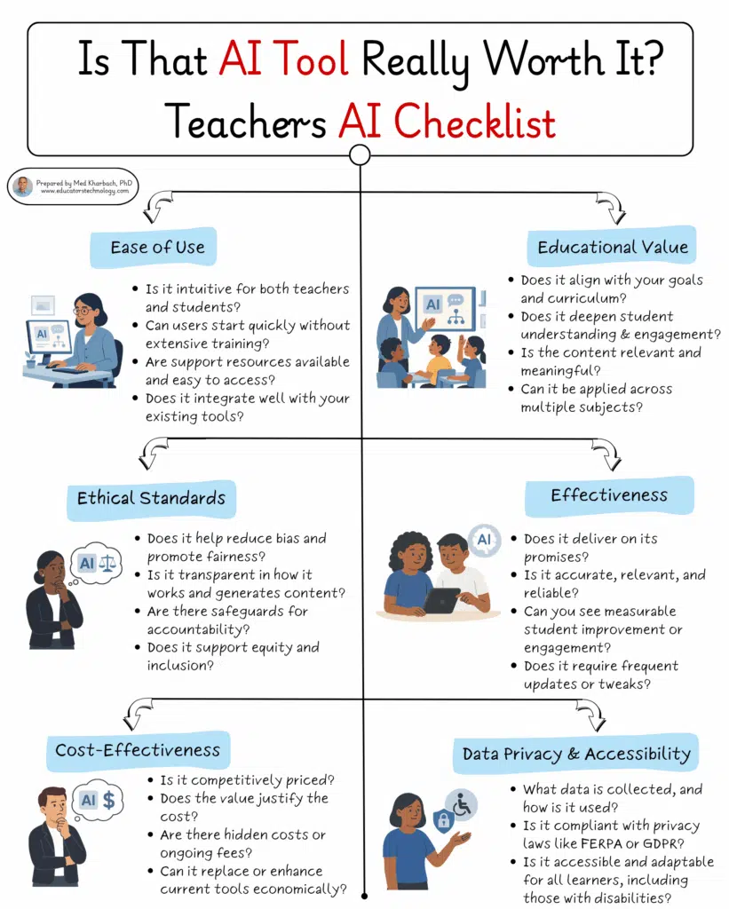 It is highly important for teachers and educators to view AI development with a critical eye, capitalizing on its benefits while wisely addressing its limitations. The criteria and questions I shared in this checklist are designed to help you navigate the complexities of AI adoption in the classroom, ensuring that the tools you choose enhance educational outcomes and uphold the highest standards of ethics, privacy, and accessibility.