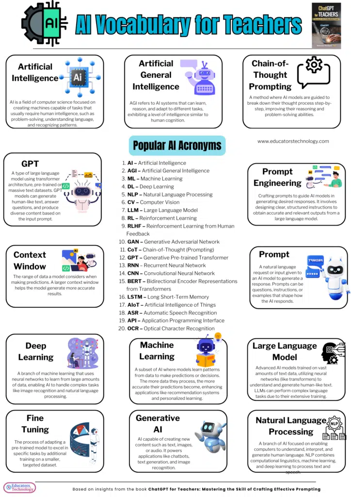 To this end, I created this cheat sheet based on my recent book ChatGPT for Teachers: Mastering the Skill of Crafting Effective Prompts. In it I featured some of the popular AI concepts I believe teachers and educators need to know to help them understand what AI is all about. So I invite you to go through the list, familiarize yourself with the AI terminology and share with us your suggestions and feedback.