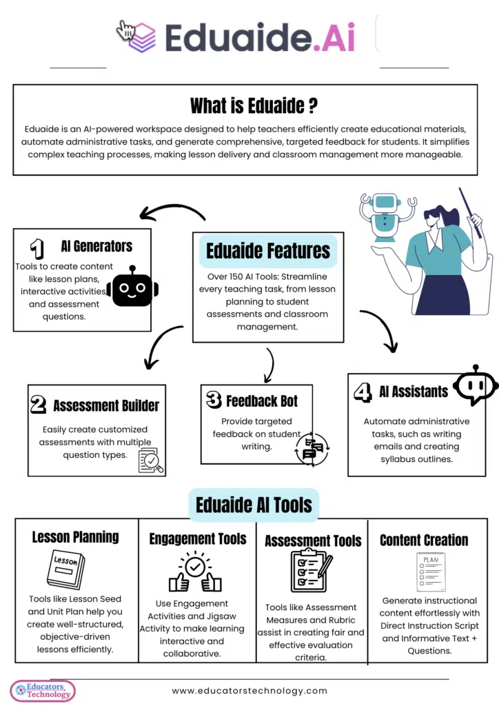 Eduaide is a platform that offers teachers an AI-powered workspace where they can create educational materials, automate administrative tasks, and generate targeted feedback. Eduaide offers access to an extensive list of AI tools that includes over 150 tools that help teachers with things such as assessment, content creation, lesson planning, creating interactive activities, gamifying learning, teacher parent communication, educational resources management, and many more.