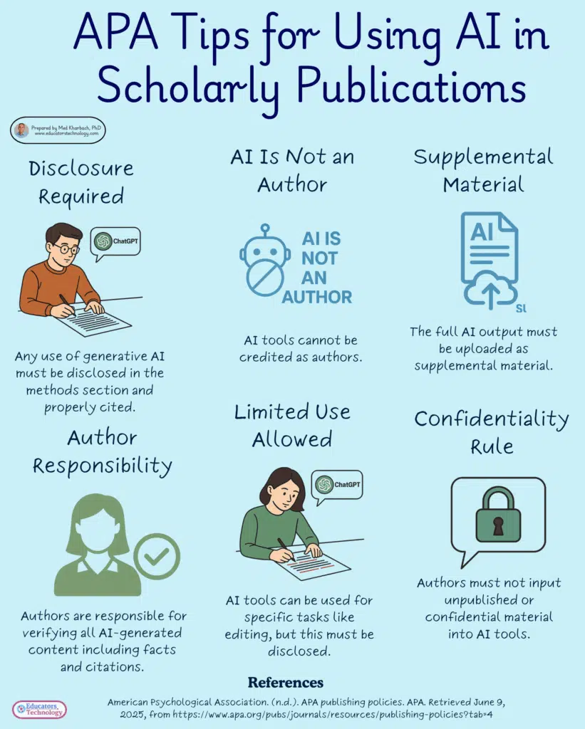 Here’s a concise summary of the APA tips for using AI in scholarly publications: