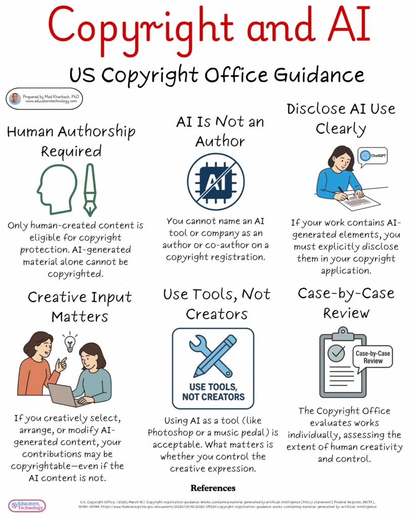 - U.S. Copyright Office. (2023, March 16). Copyright registration guidance: Works containing material generated by artificial intelligence [Policy statement]. Federal Register, 88(51), 16190–16194. https://www.federalregister.gov/documents/2023/03/16/2023-05321/copyright-registration-guidance-works-containing-material-generated-by-artificial-intelligence