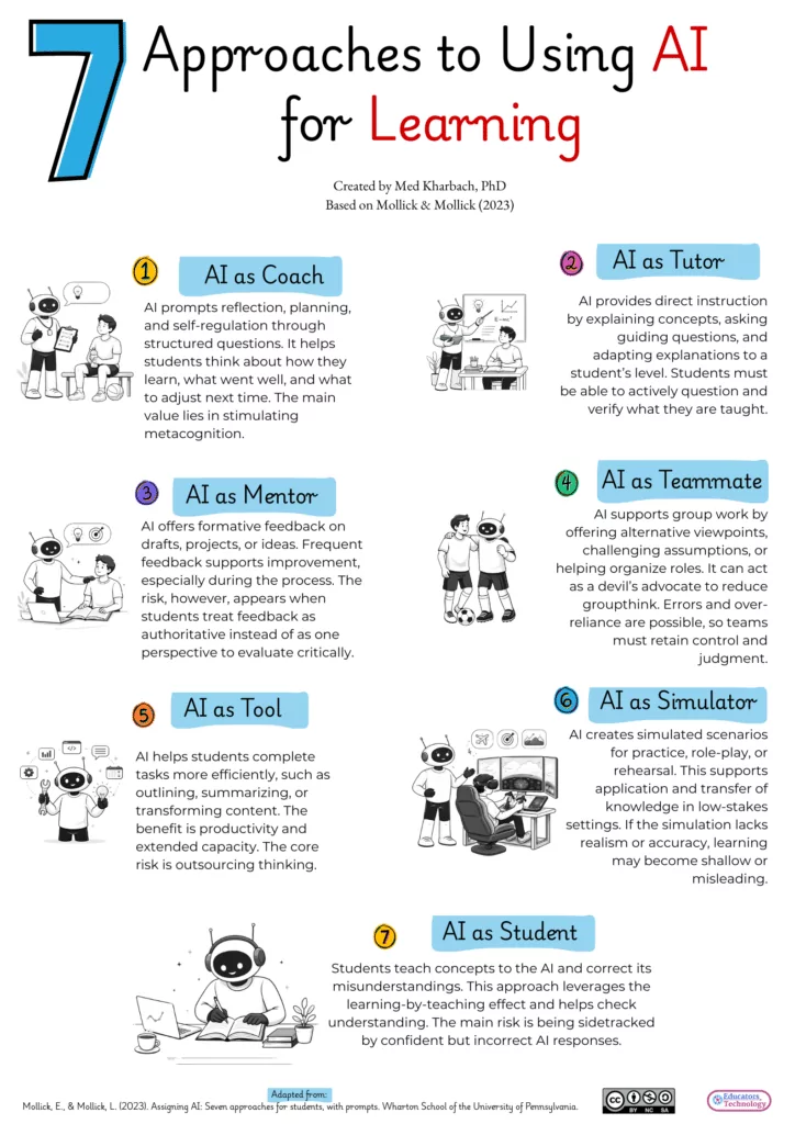 In 2023, Ethan Mollick and Lilach Mollick from the Wharton School published a paper that moved the conversation forward. They identified seven distinct approaches to using AI for learning, each with its own pedagogical purpose and risks.